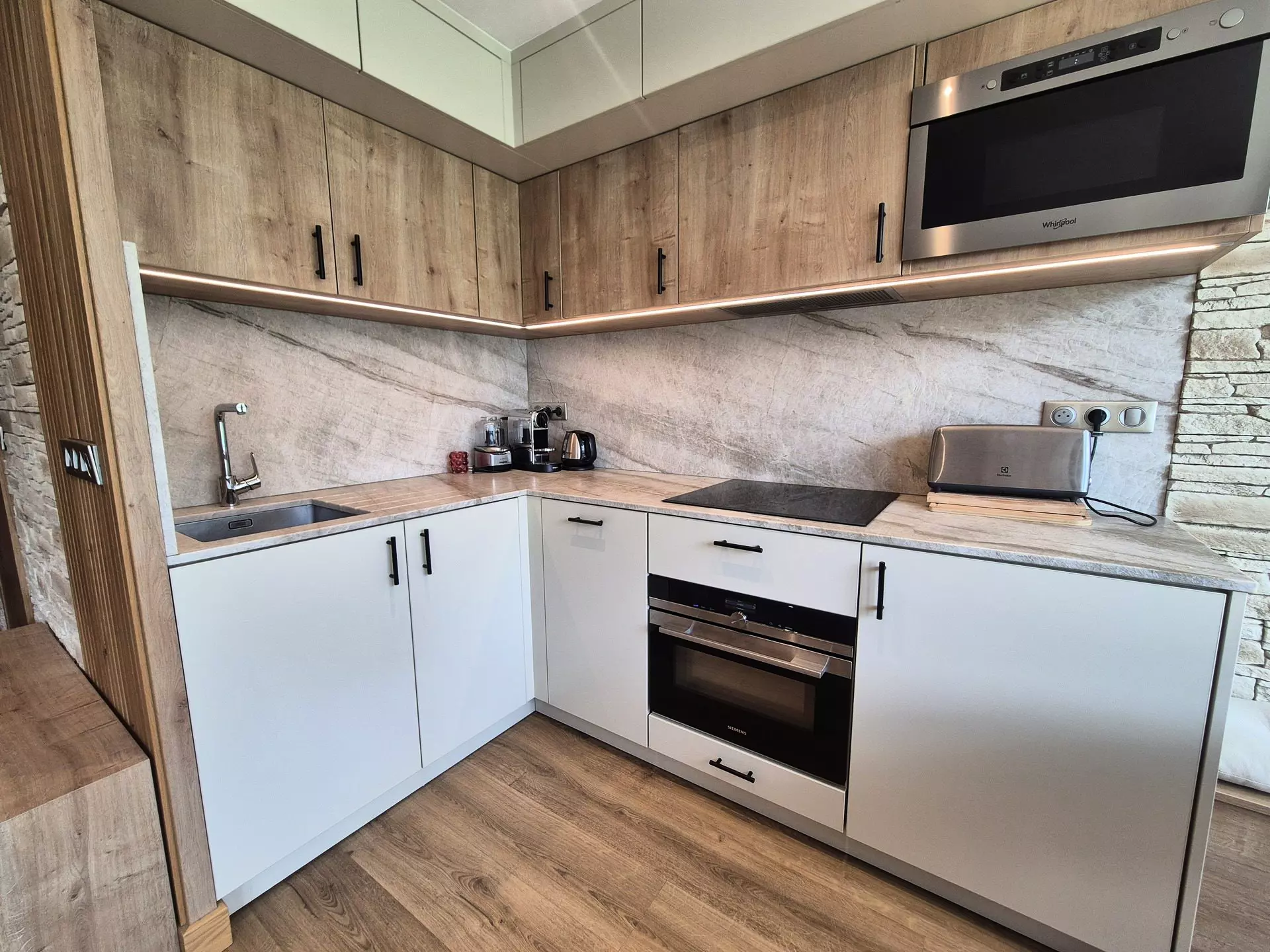 Offene Küche mit Mikrowelle, Multifunktionsbackofen, Geschirrspüler, Induktionskochfeld und Kühlschrank. Außerdem ausgestattet mit Kaffeemaschine (Nespresso und Filterkaffeemaschine), Toaster, Raclettegrill, Fondue-Set...