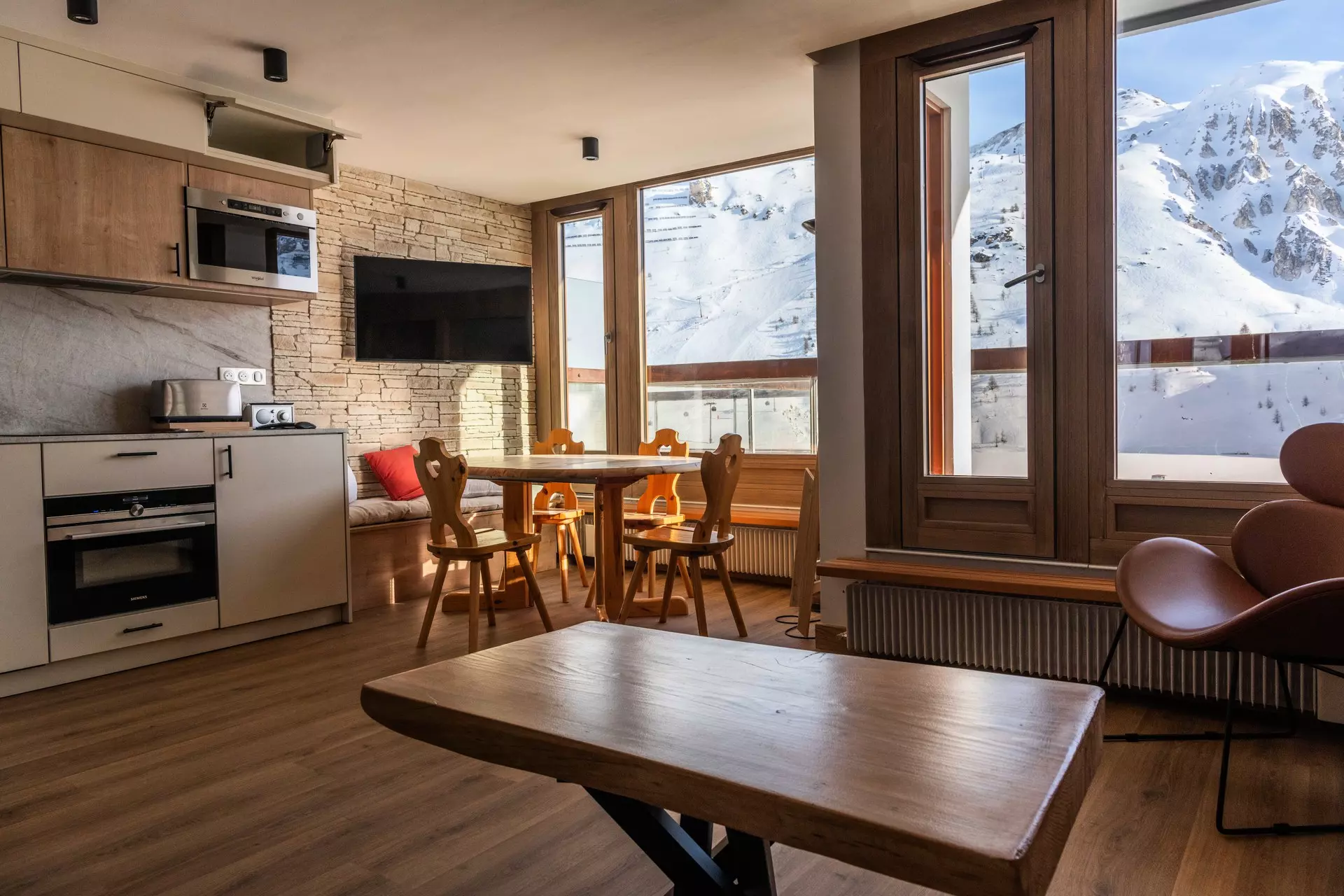 Wunderschöne, komplett renovierte 2-Zimmer-Wohnung (42 m²) für 4 Personen im 1. Stock (mit Aufzug) der Wohnanlage „Combe Folle“ in Tignes-le-Lac. Ideale Lage direkt an den Skipisten.