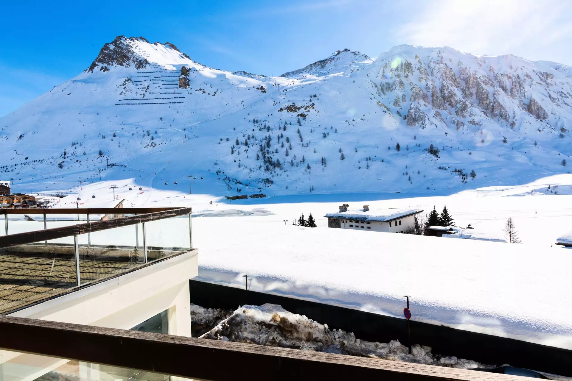 Südostseitig ausgerichtete Wohnung mit Balkon und Gartenmöbeln, die einen wunderschönen Blick auf den See und den Gletscher Grande Motte bietet.